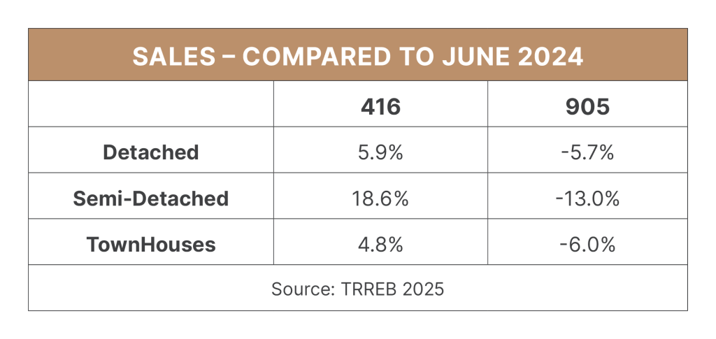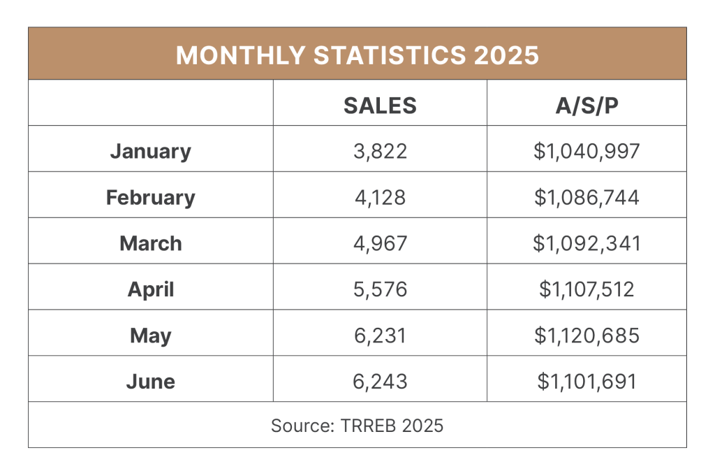 In June, the Toronto Regional Real Estate Board reported 6,243 home sales. Although the number of reported sales was 2.4 percent fewer than the 6,397 reported sales last June, the comparison was the smallest negative year-over-year variance of 2025. For example, the negative variance was more than 23 percent in April and over 13 percent in May. Also, June represented the 5th consecutive month that saw an increase in sales compared to the month before.